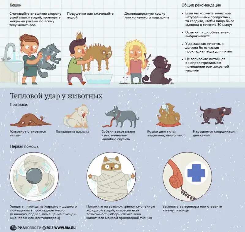 Первые признаки теплового удара — одышка, вялость и нарушение координации. В случае, если ваш питомец стал жертвой летнего солнца, его следует увести в прохладное место, обернуть тело прохладной мокрой тканью и вызвать ветеринара.