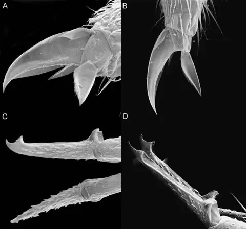 Коготки (A, B) и крошечные колючки диковинной ногохвостки (фотографии Rafael Jordana et al./ Terrestrial Arthropod Reviews).