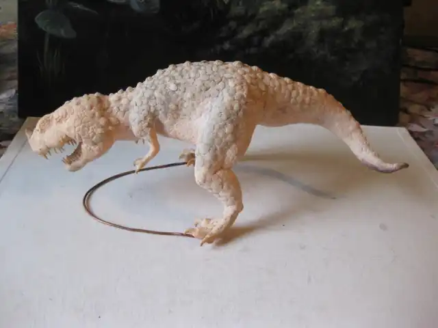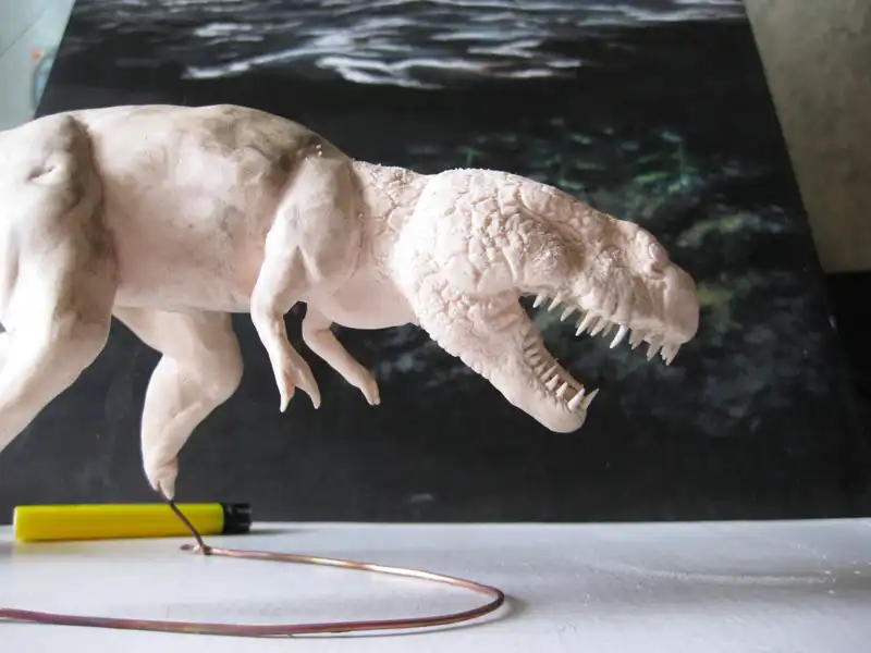 И вот зверюшка готова к запеканию. Вроде все в порядке, кроме ступней. Было принято решение довести их до ума после окончательного окоченения (сломай язык, чего уж) режуще-пилящими инструментами. Тут ти-рекс еще вялый, и поэтому любой может взять его на руки, слепить из него «снежок», например, и запулить им с балкона по лысой башке… Но мы пойдем дальше.