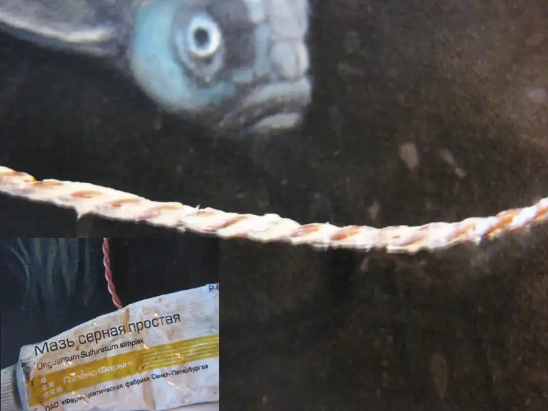 Рыба встретится в обзоре еще не один раз. Исходники – сырая пластмасса для лепки, медный провод в оплетке, из какого-то кИта акриловые краски. Рыба нарисована на холсте.