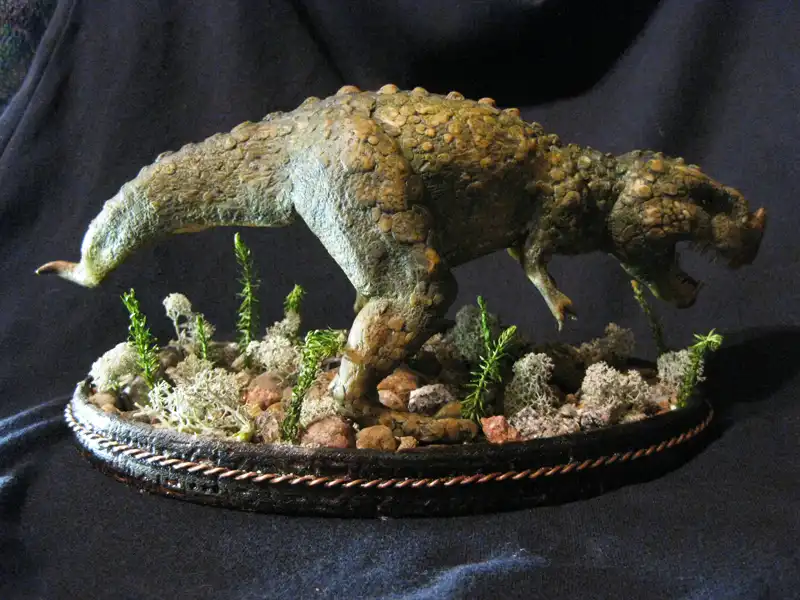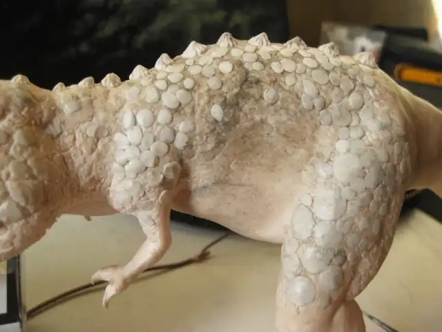 Текстурирование шкуры началось: оформлен взгляд, роговые панцирные наслоения на коже, шрамы, как ордена, и все они от старших товарищей… Хотя, скорее всего, не только. Добыча в то время была опасная. Не колбаса копченая, еще попробуй завали! Детали выминаются тонкой металлической палочкой.