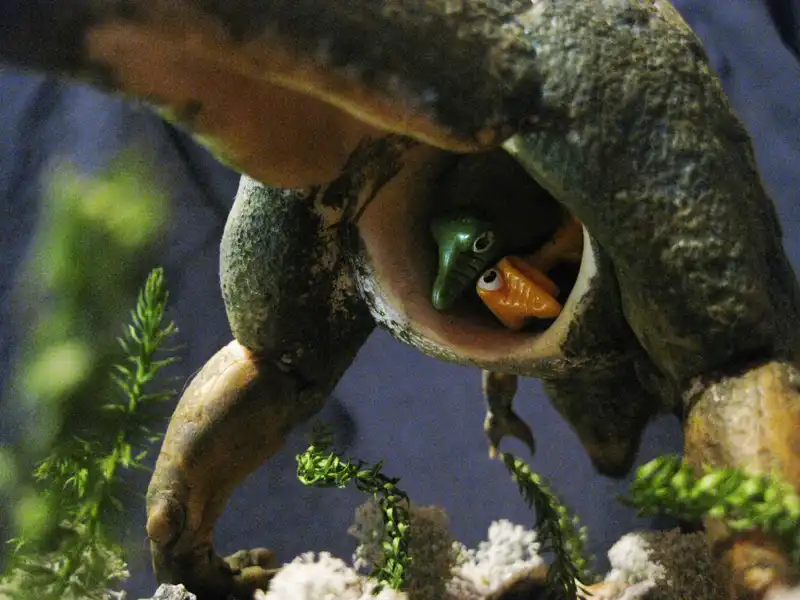 В обзор врывается рыба. Рожа у нее, будто она спрашивает: «Это че???». Динозавры такого типа – они как птицы. Видел недавно видео, как куры балуются жирными буржуйскими тараканами,- похожая модель поведения. Клюнул мелкого динозавра, насколько хватило черпака, и своими бройлерными окорочками засеменил в лес, пока не отняли. Потому что отнимали часто, бывало. Следствием юношеских стычек должна служить рябая, местами подпорченная в драках шкура.