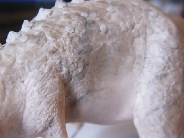 Потихоньку вырисовывается. Появились роговые отростки, шкура приобретает текстуру. От лепки пластмасса очень пачкается, за чистотой уследить сложно. Где-то на этом этапе я додумался использовать тальк. Очень помогает изделию не липнуть к рукам.
