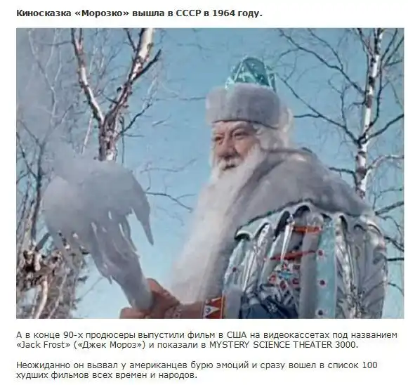 Ну, значит, не только наши киношники перековеркивают названия зарубежных фильмов. Было очень интересно узнать мнения зарубежья. Но "их" мнение о "Морозко" весьма невежественное и исковеркано их восприятием и миропонимание, само название "Джек Мороз" могу только сделать-