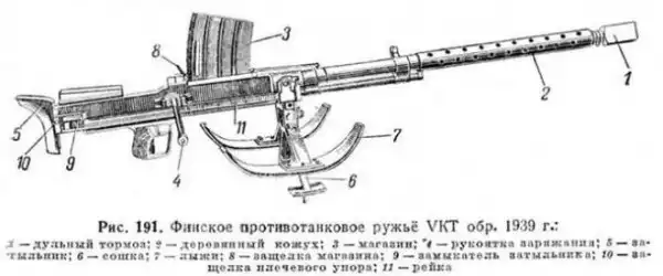 Отличительной чертой финского ПТР было наличие двух спусковых механизмов: заднего - для удержания на боевом взводе подвижной системы и переднего - для удержания ударника. Передний спусковой механизм действует только тогда, когда подвижная система находится в крайнем переднем положении и произошло полностью запирание затвора. Задний спусковой механизм обеспечивает более интенсивное охлаждение ствола, задерживая подвижную систему в заднем положении после каждого выстрела. Передний спусковой механизм позволял вести только одиночный огонь. Коробчатый секторный магазин с шахматным расположением 10 патронов крепился сверху.