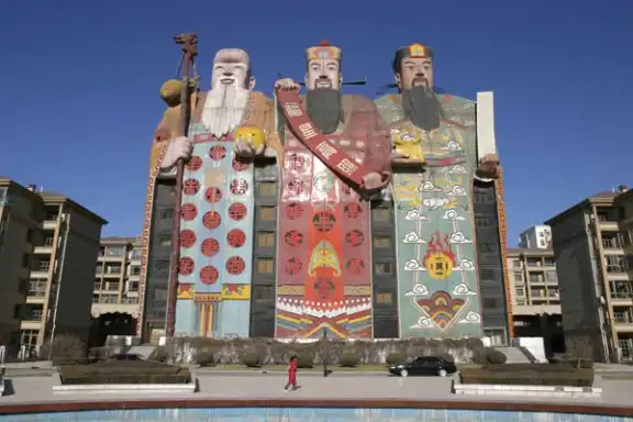 Этот 10-ти этажный отель расположен в китайской провинции Хэбэй. Отель Tianzi занесён в Книгу Рекордов Гинесса как самое большое здание-скульптура. Его фасад представляет собой фигуры Богов – Фу, Лу и Шоу, приносящих удачу, процветание и долголетие. Вход в отель расположен у правой ноги Бога Шоу.