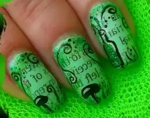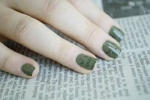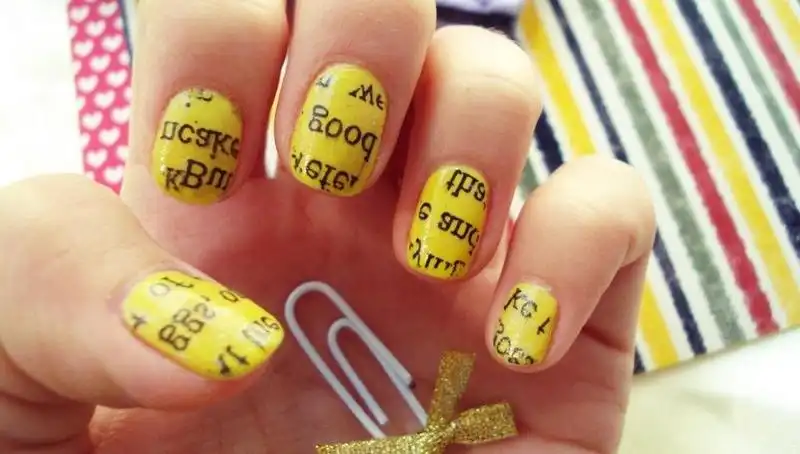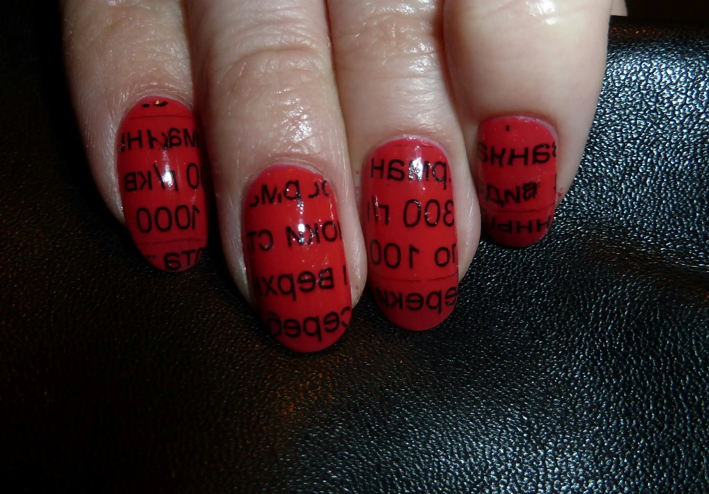 3. Газета. Любая, лишь бы отпечатывалась. Можно цветную. Можно распечатать рисунок на принтере. Вырезаем кусочки газеты, по размеру равные ногтям. Прикладываем их на ноготь.