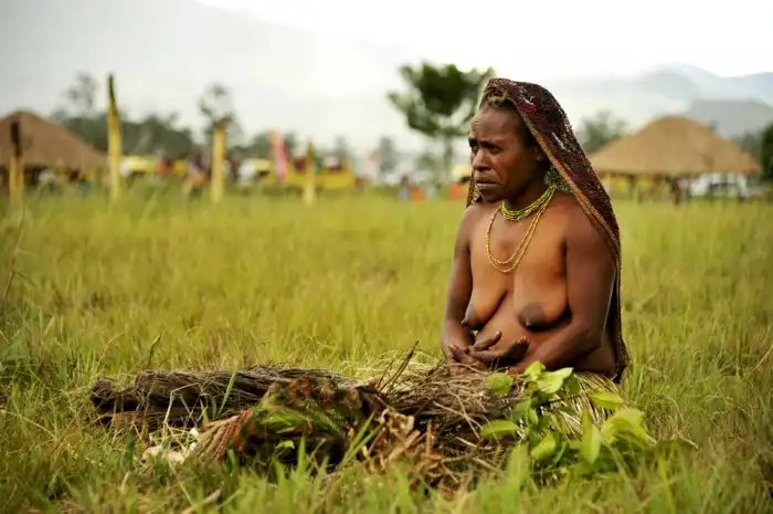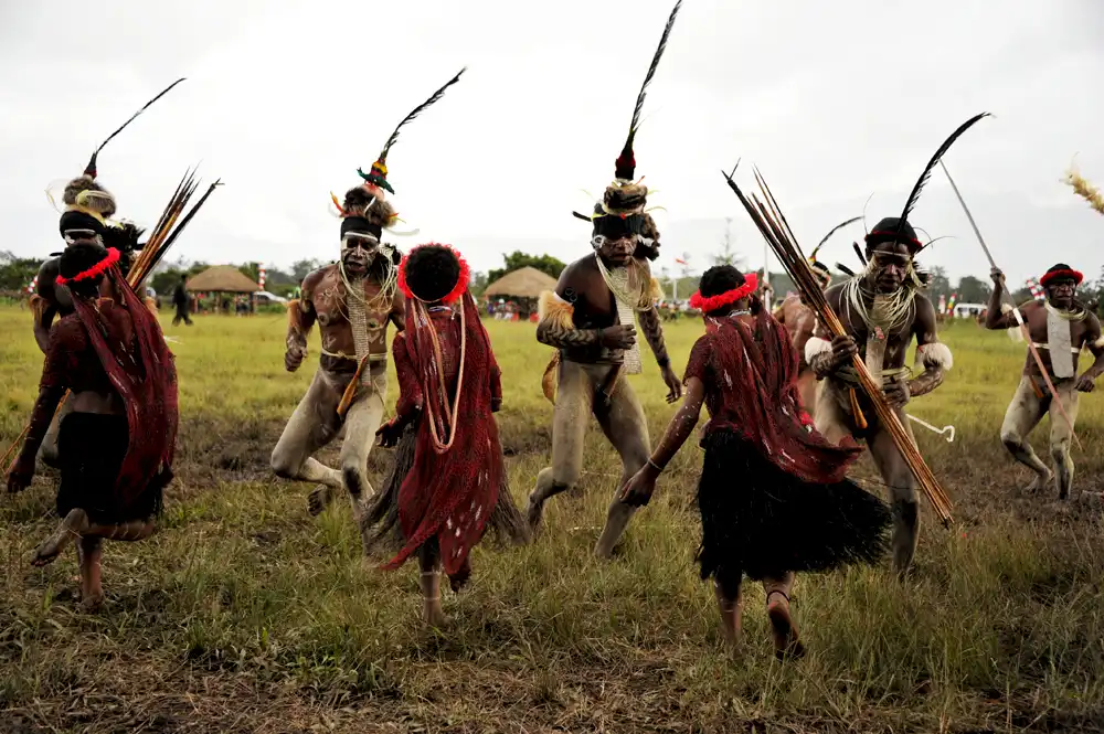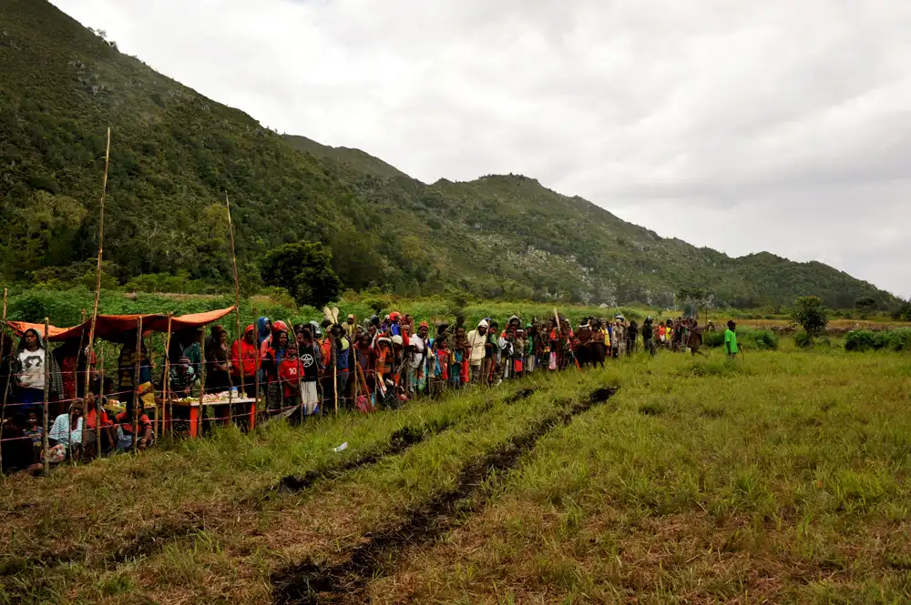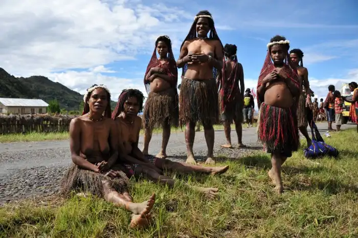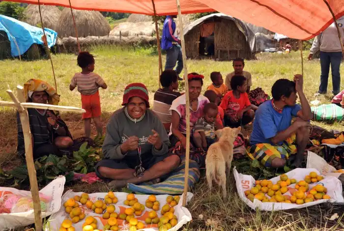 Пока на полигоне пляшут и точат копья, поодаль раскинулся папуасский бедлам. Торгуют безвкусными мандаринами за 2 доллара 10 штук, наркотическим пеналом, от которого зубы папуасов становятся алыми, рисом и питьевой водой втридорога.
