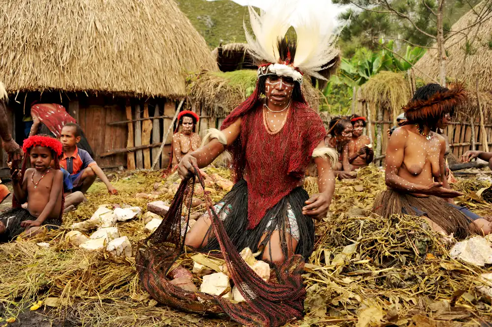 Находятся и самые лукавые, позирующие для фотографов в сторонке и собирающие дань папиросами. Курение дешевого табака и жевание здешнего легкого наркотика «пенала» – два главных удовольствия в долине Бальем. Индонезийцы запрещают завозить сюда алкоголь, так как от самых микроскопических его доз аборигены дуреют невероятно. Все же данийцы научились производить кое-какое пойло из батата и по вечерам молодежь может русскому туристу напомнить родимых гопников. Однако на фестивале утро, и небо безоблачно.