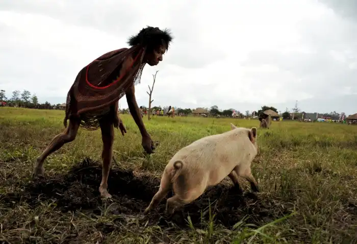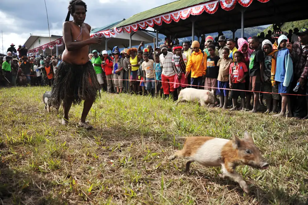 В ближайшем к полигону дворе пекут свинью. Это традиционный папуасский рецепт (если кто окажется в долине Бальем, то сможет за 100 долларов в любой деревне наблюдать этот процесс и вкушать его плоды). Тушу свинки сперва обжаривают на открытом огне, после кладут на раскаленные камни и накрывают сверху душистыми травами и сеном. Спустя час – пожалуйте к столу.