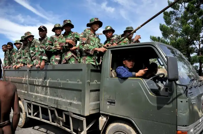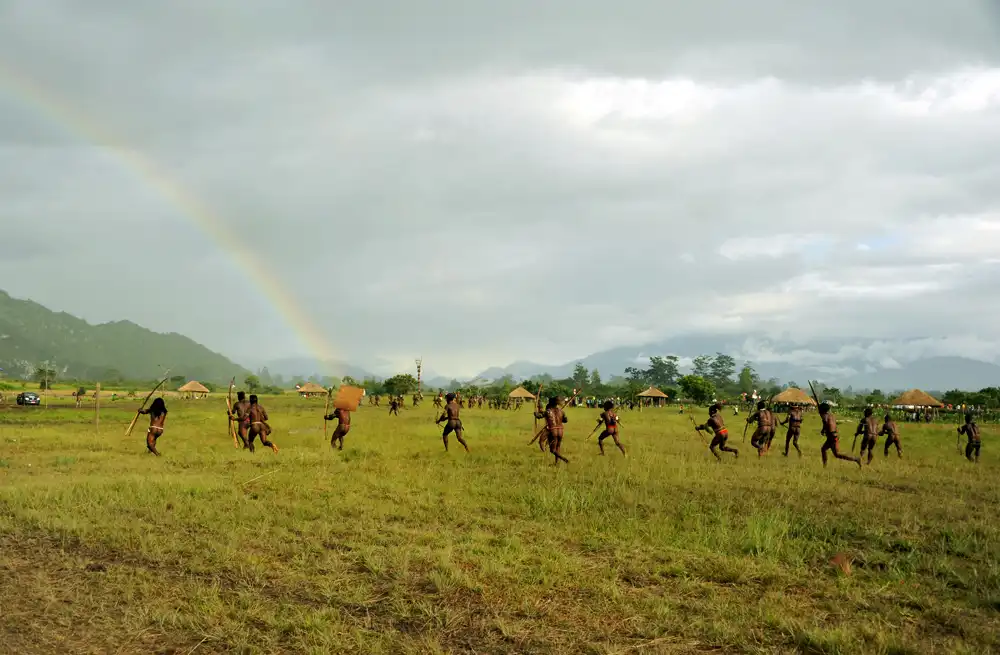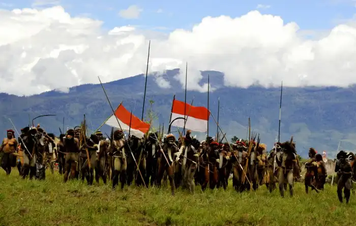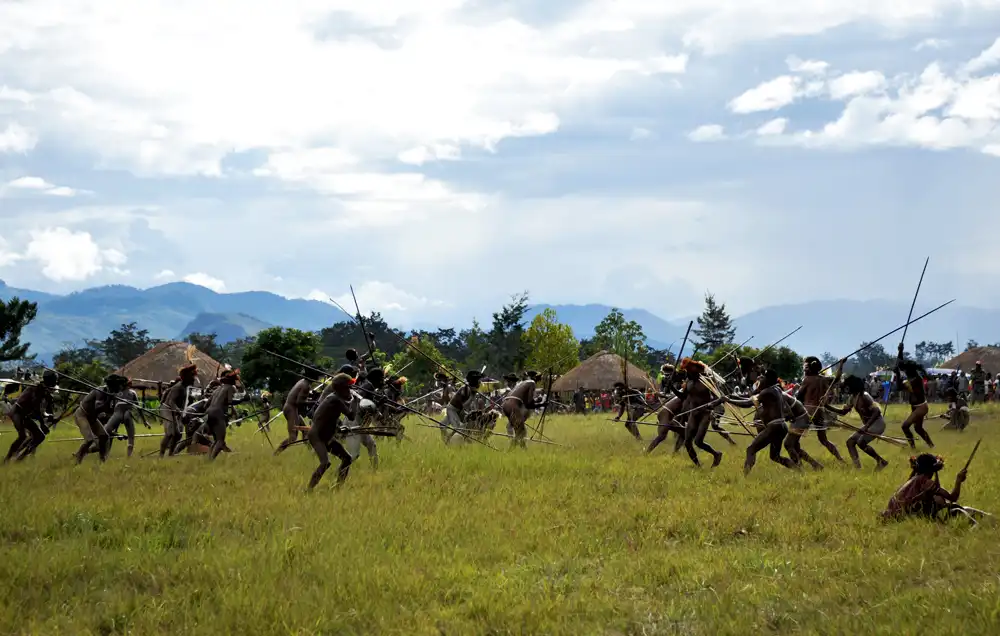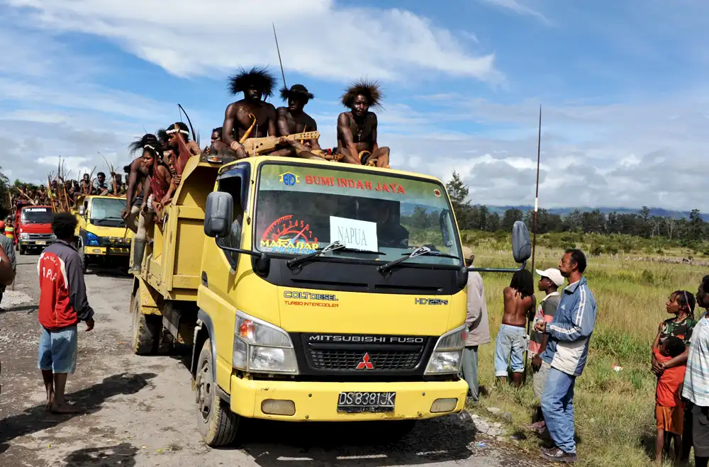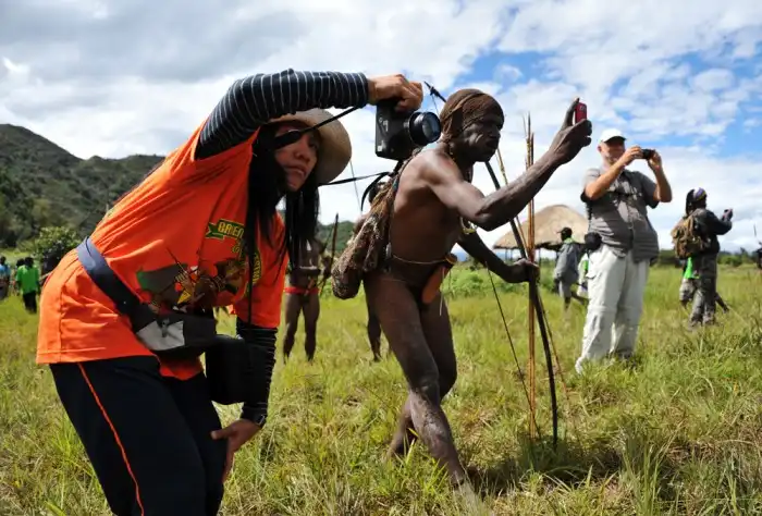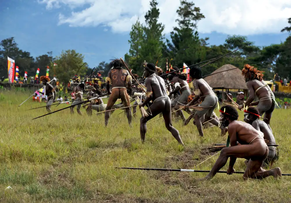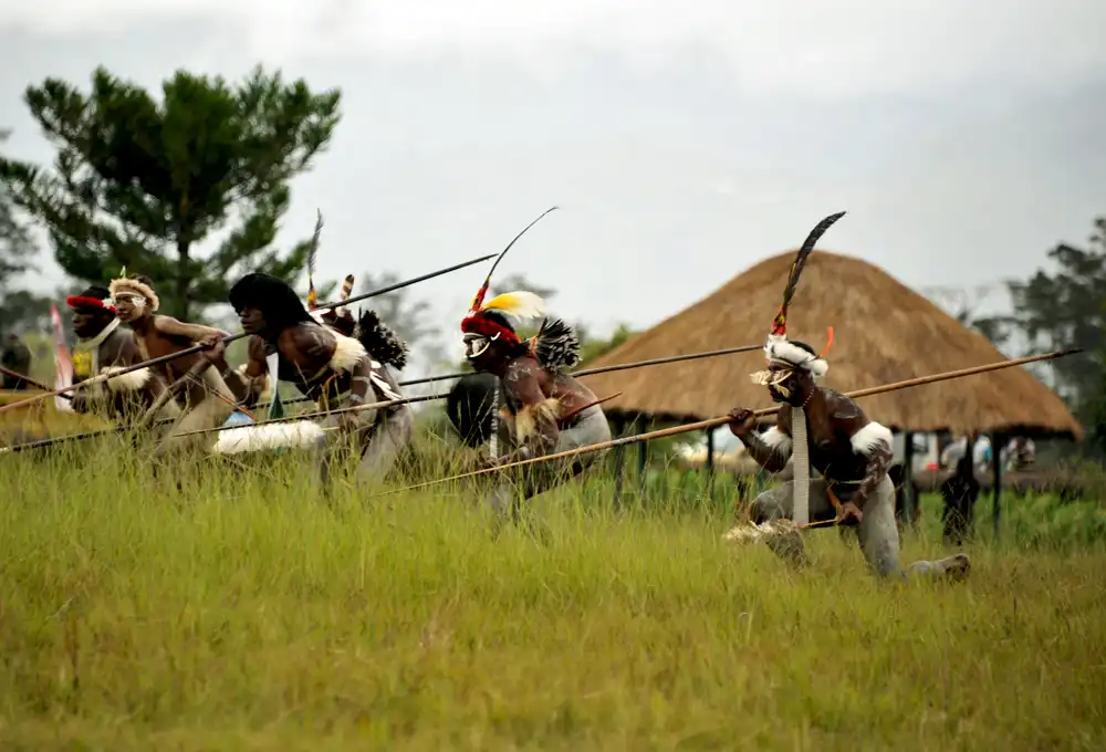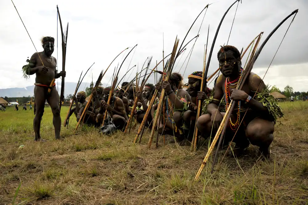 В пропорции 1 к 1 самосвалы подвозят индонезийских солдат. Кругом расставлены полицейские спецназовцы с М-16 и поясами гранат, как у революционных матросов в 1917 году. Папуасы уже пытались провозгласить независимость (это завершилось убийством их предводителя), но фестиваль и собрание всех мужчин племени при оружии и в боевой окраске – прекрасный повод для восстания! Ухо востро – и за папуасами на полигон.