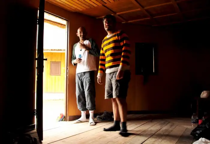 Эти двое прекрасных парней из Лондона будят меня в хижине на склоне горы в Восилимо. Уже слышен бой барабанов, а значит нужно спешить на поле за деревней, где сегодня должен начаться трехдневный фестиваль народа дани. Но прежде о моих друзьях. Карл (что в белой футболке) и Остин (что полосатый) – глухонемые. Причем Остин – глухонемой «гламурный» фотограф – вы частенько видели его моделей, овеянных розовым ароматом духов Gucci (если есть такие духи) на пыльных улицах Москвы.