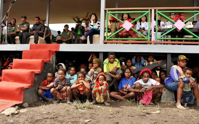 Вот и картина того, что такое папуас в папуасии. VIP-трибуна – а под ней собственно народ. Здешние организаторы-полицаи беспощадно гоняют запуганных людей палками, а цена на билет в 25 долларов оставляет их за гранью праздника жизни. Но они пробираются!