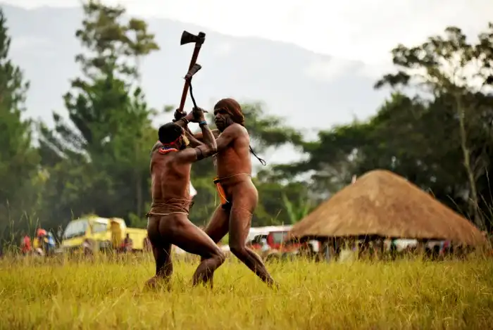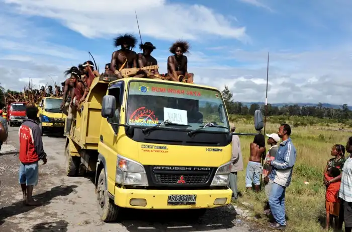 Отвоевавшихся папуасов развозят самосвалы, мы же, бездельные туристы, на подкашивающихся от усталости ногах плетемся к хижине.