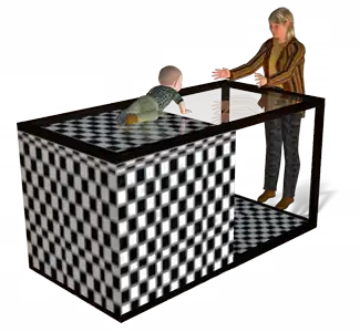 Они смастерили так называемый «зрительный обрыв» — хитроумную конструкцию из щитов, положенных поверх толстого стекла. Потом всё это было замаскировано при помощи ткани с соответствующим рисунком. В результате возникала полная иллюзия, что на месте стекла — пустое пространство до самого пола. Казалось бы — что страшного, никакой реальной опасности для крохи нет.