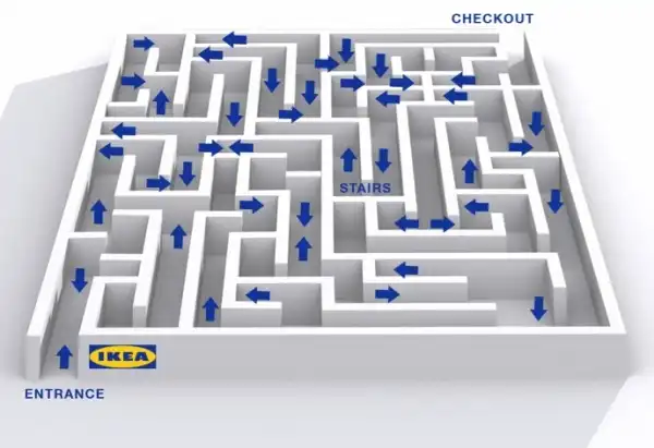 Все до единого магазины устроены таким образом, что покупатель вынужден пройти весь магазин от начала до конца. При этом IKEA не решается нервировать своих самых постоянных и самых преданных покупателей, поэтому способы срезать путь есть, но очень неприметные, их знают только те, кто действительно регулярно бывает в магазине. Или те, кто въедливо изучает схему передвижения по территории. Тем же, кто не изучает и не выбирает краткую дорогу, тоже не придется напрягаться. Роль дороги, вымощенной желтым кирпичом, в IKEA играет серая дорожка с крупными стрелками.