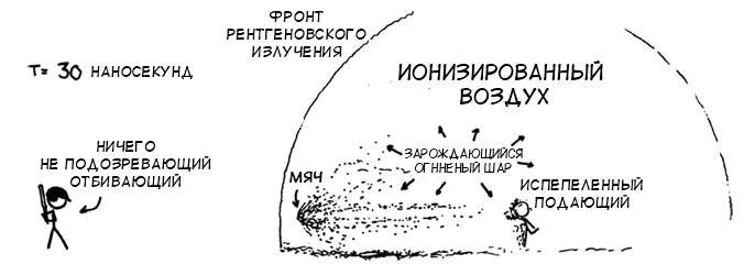 Эти гамма-лучи и осколки будут пузырем разлетаться в направлении от подающего. Они начинают ионизировать воздух, отрывая электроны от ядер — и воздух будет превращаться в расширяющийся пузырь раскаленной плазмы. Поверхность этого пузыря будет приближаться к отбивающему со скоростью света — лишь слегка опережая летящий мяч.