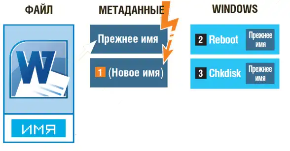 3. После нее стартует программа Chkdisk. Она анализирует файловую систему на наличие ошибок и при необходимости исправляет их. Между тем набор данных ReFS находится в стабильном состоянии. Прежнее имя файла снова становится действующим сразу после отказа питания.