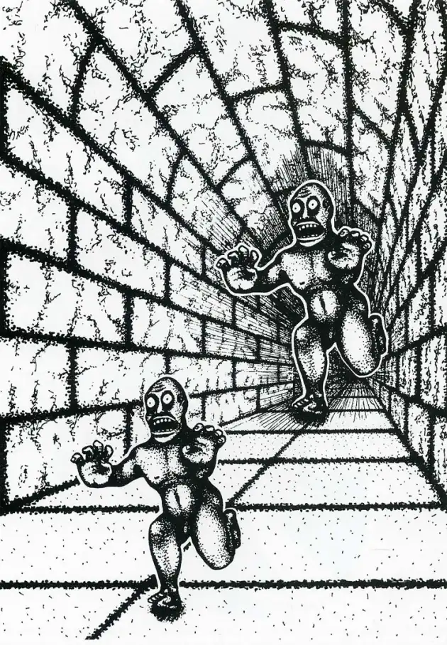 Иллюзия Роджера Шепарда, связанная с восприятием перспективы. На рисунке убегающий монстр кажется значительно меньше догоняющего.