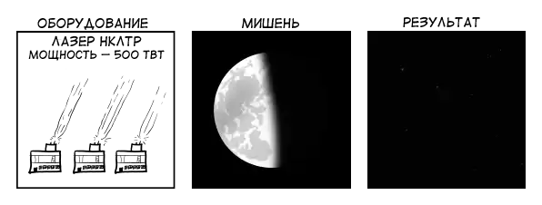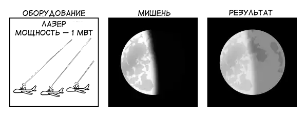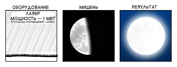 Ладно, давайте установим по мегаваттному лазеру на каждом квадратном метре поверхности Азии. Если мы попробуем запитать всю эту установку, используя электроэнергию, вырабатываемую из нефти, то все резервы Земли будут исчерпаны за 2 минуты. Но в эти минуты Луна будет выглядеть так: