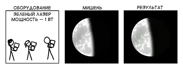 Для сравнения, освещенность Земли от полной Луны составляет около одного люкса — а значит, наши лазеры будут неэффективны не только при освещении Луны с Земли, но и если мы попробуем обратное — осветить Землю с Луны, то зелень лазера просто потонет в естественном лунном свете.