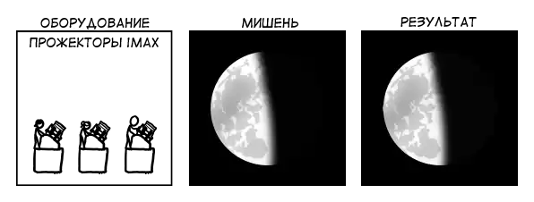 Лазерная указка, которую мы используем, излучает примерно 150 люменов света (больше, чем большинство фонариков) лучом, шириной в 5 угловых минут. Свет этот, попадая на поверхность Луны, дает освещеноость лишь около половины люкса, в то время как Солнце — около 130 тысяч люксов. И даже если мы нацелим все указки идеально в одну и ту же точку — в лучшем случае мы получим полдюжины люксов на 10% поверхности Луны.