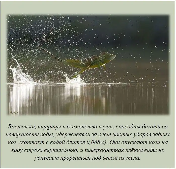 Василиски... способны бегать по поверхности воды, удерживаясь за счёт частых ударов задних ног (контакт с водой длится 0,068 с). Они опускают ноги на воду строго вертикально, и поверхностная плёнка воды не успевает прорваться под весом их тела.