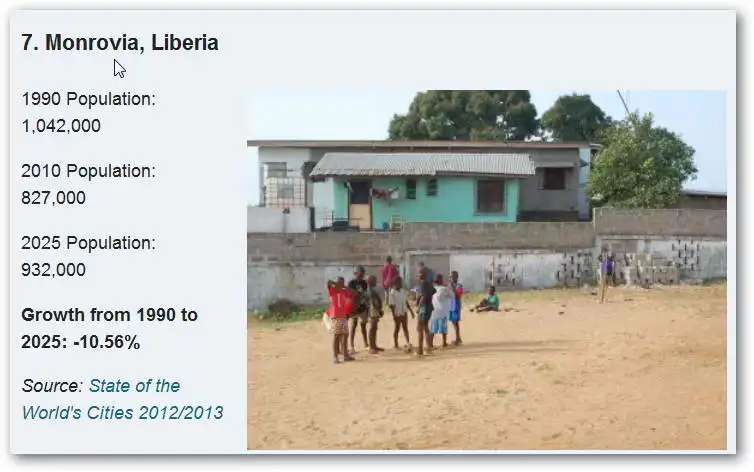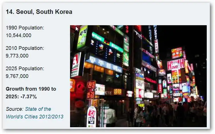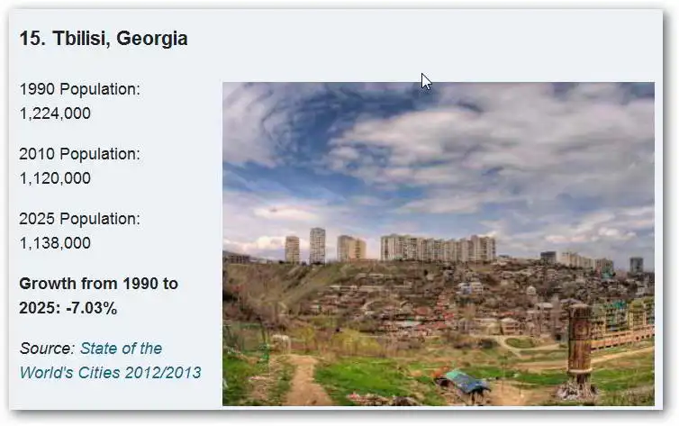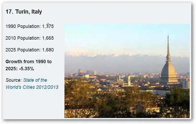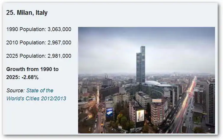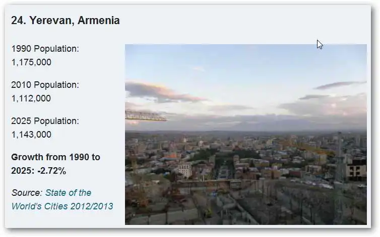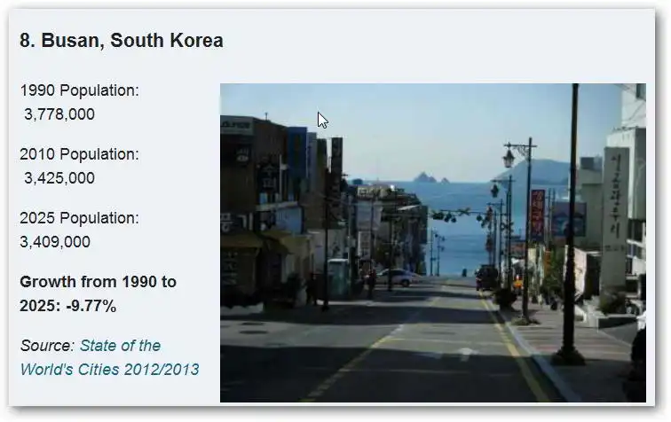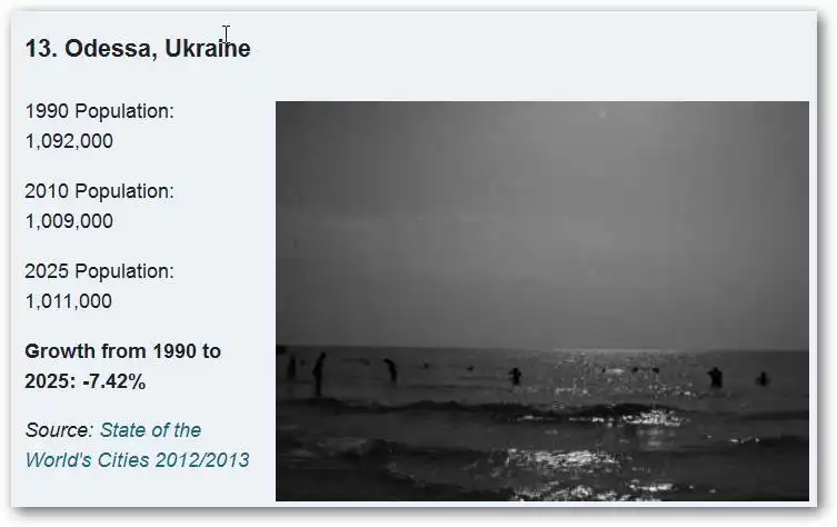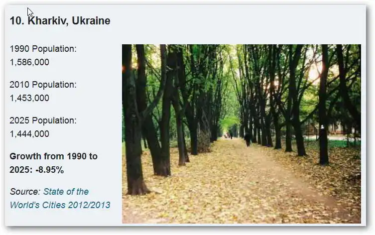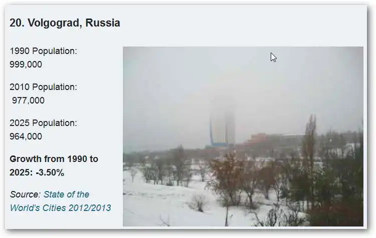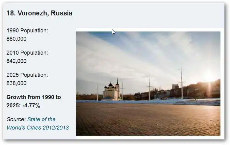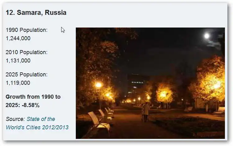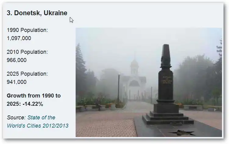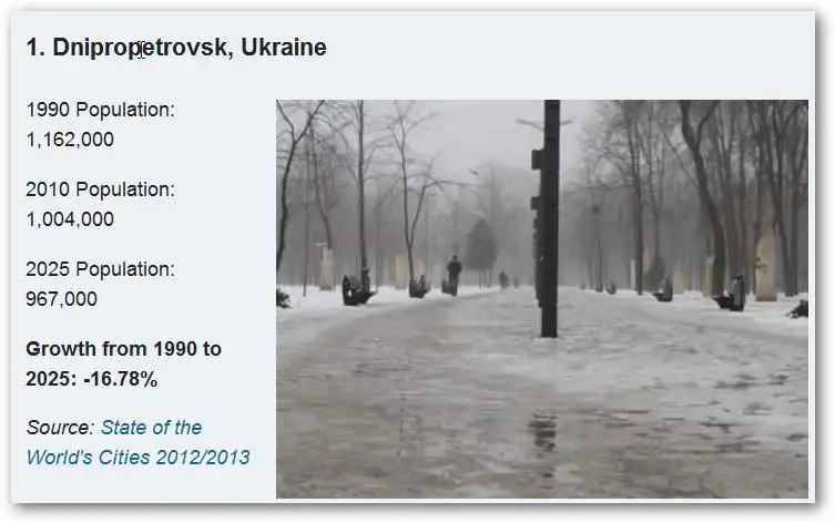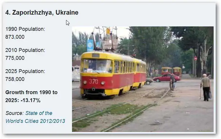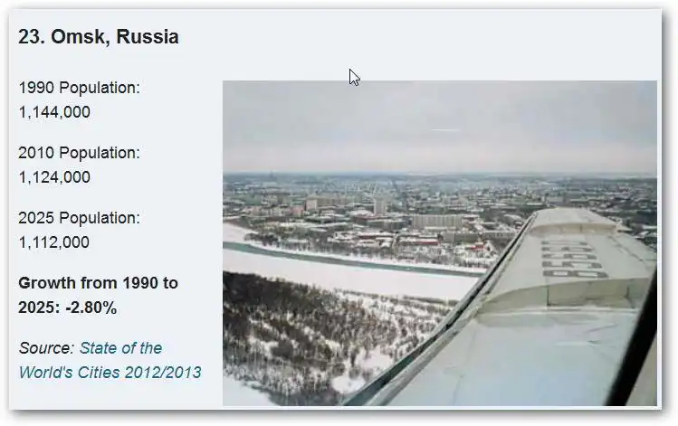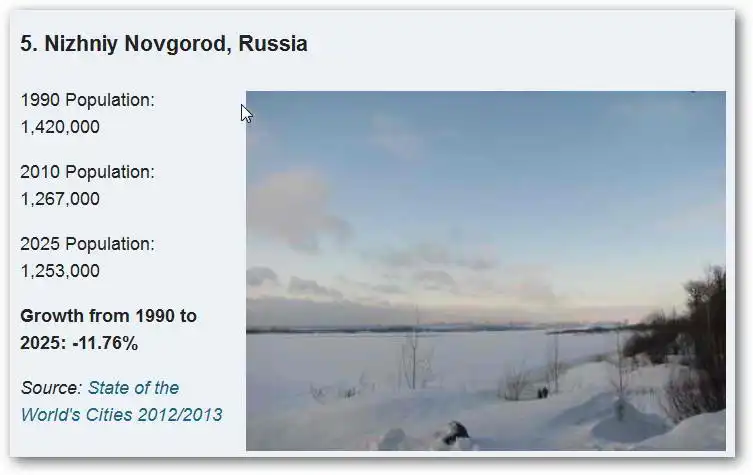 В то же время еще 11 российских городов отличились с худшей стороны. Business Insider перекомпоновал представленные в отчете данные (население городов с более чем 750 000 жителей на 1990 и 2010 год, а также прогноз на 2025 год) и составил рейтинг 28 самых быстро вымирающих городов. Из них 11 российских, пять украинских, три итальянских, два южнокорейских, а также по одному городу в Венгрии, Либерии, Грузии, Румынии, Чехии, Армении и Кубе.