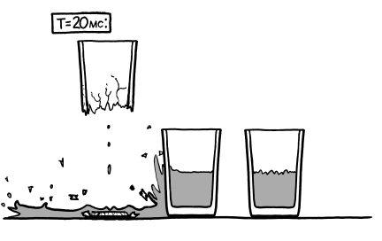 Тем не менее, стакан и вода сейчас двигаются слишком быстро для образования пара. Менее чем через 10 миллисекунд после начала отсчёта, они летят навстречу друг друга со скоростью в пару метров в секунду. Без воздушной амортизации между ними, ведь там только пара капелек водяного пара, вода ударяется в дно стакана как молот.