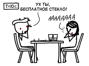 Через полсекунды, наблюдатели, услышав хлопок, вздрогнули. Их головы непроизвольно следуют за взлетающим стаканом.