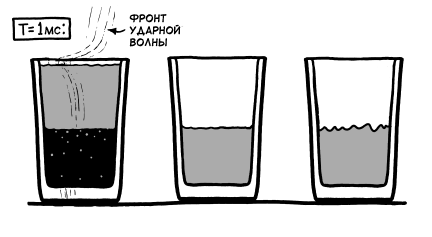 Действие ударной волны от вакуумного коллапса будет продолжаться около миллисекунды, чего будет достаточно чтобы распространиться на другие два стакана. Стакан и вода слегка прогибаются по мере того, как волна проходит сквозь них. Ещё через пару миллисекунд она достигнет человеческого уха и мы услышим громкий хлопок.