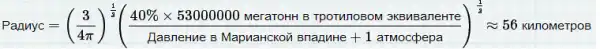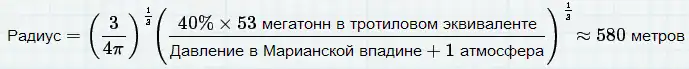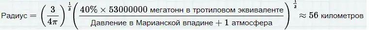 Взрыв на дне Марианской впадины создаст быстро расширяющуюся сферическую полость горячего пара. Чтобы представить насколько большой она будет, воспользуемся формулой из статьи 1971 года «Вычисление подводных взрывов по различным моделям»: