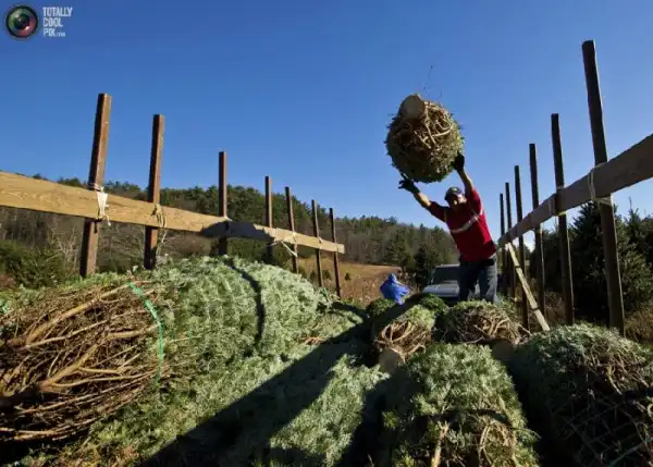 8. Педро Карденас бросает ель в прицеп в питомнике Омни в Западном Джефферсоне после того, как она была обмотана в поле перед отправкой.