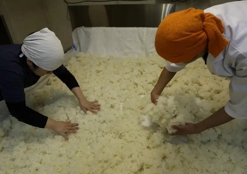 Госпожа Каваиси добавляет в пропаренный и охлажденный рис плесневой гриб кодзи, который инициирует процесс брожения. Именно он стал заменителем человеческой слюны при варении саке.