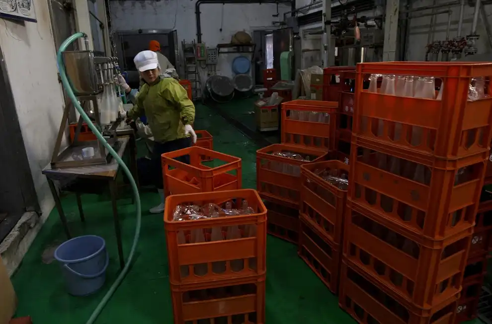 Работники разливают саке по бутылкам, доставая их из решетчатых ящиков.