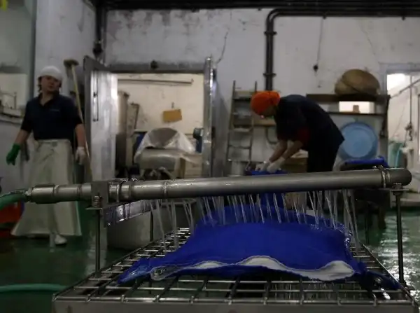 Миса Каваиси развешивает сумки с замоченным рисом.
