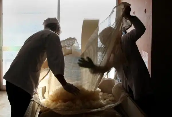 Миса Каваиси с коллегой распределяет пропаренный рис по полотну для охлаждения.