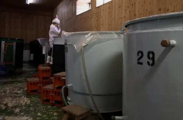 Шеф-повар Миса Каваиси (Misa Kawaisi) размешивает ферментированный рис на заводе по варению саке «Надагику-Содзо»