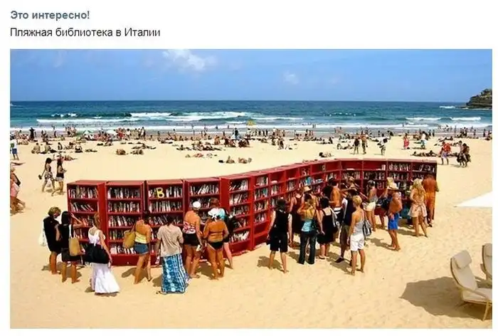 Сотни пабликов и групп, а вслед за ними и сотни сайтов бездумно копируют эту фотографию или просто с подписью "Пляжная библиотека в Италии" или даже с более пространным лирическим отступлением: "В Италии открылись первые библиотеки в рамках программы «Пляжные библиотеки-2012»"