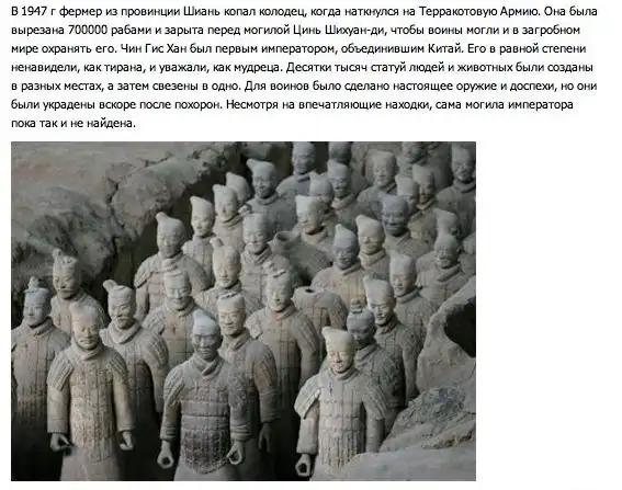 Так, давайте по порядку, крестьяне бурили скважину, а не копали колодец. Обнаружена не в 1947 году, а в 1974. "Она была вырезана 700000 рабами и зарыта перед могилой Цинь Шихуан-ди" и "сама могила императора пока так и не найдена" как то противоречат друг другу. Могила найдена, только пока еще не вскрыта, работы в гробнице продолжаются и по сей день. А теперь главный вопрос- причем здесь Чингисхан, который родился спустя 14 веков?