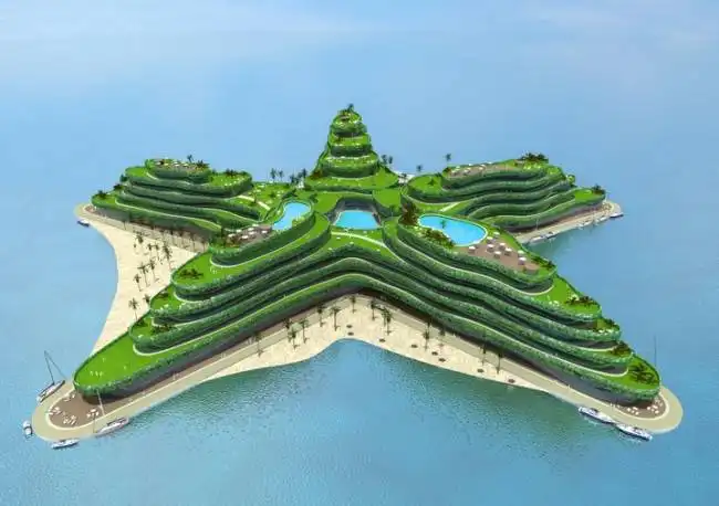 Проект плавучего дома-острова общей площадью 1.400 м2 с жилыми помещениями, бассейном, автономным электропитанием, водоснабжением и системой экологичной переработки отходов
