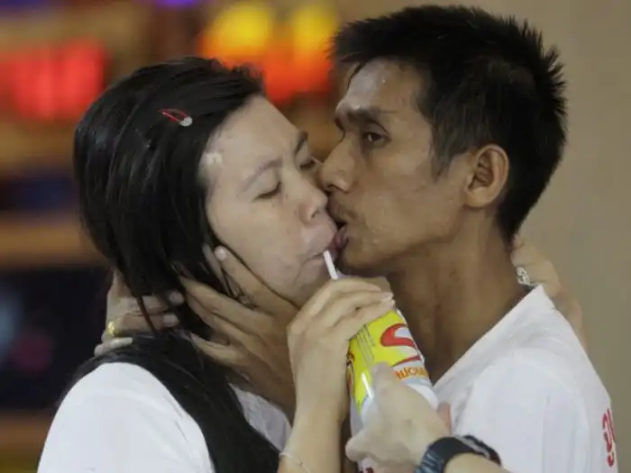 Лакшана Тиринара взбадривается энергетическим напитком в ходе попытки побить мировой рекорд по самому долгому поцелую,