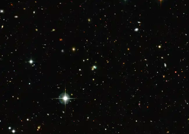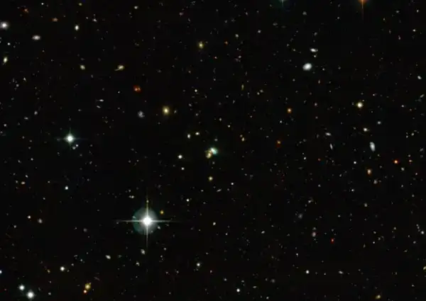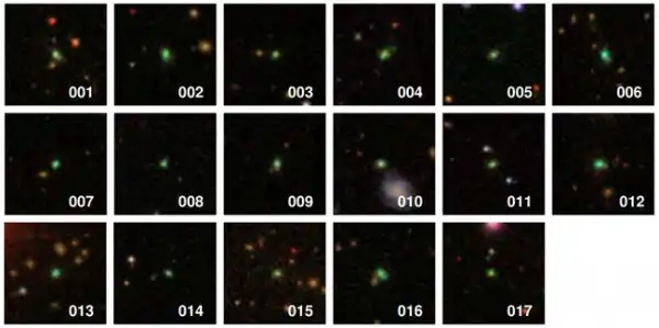 «Зеленая фасоль» с собратьями, необычные цвет и яркость которых объясняется свечением ионизованного кислорода в пределах всей галактики. Из более чем миллиарда галактик, просеянных Ширмером и его коллегами, удалось выделить только 17 «фасолин». Источник: CFHT/M. Schirmer et al.
