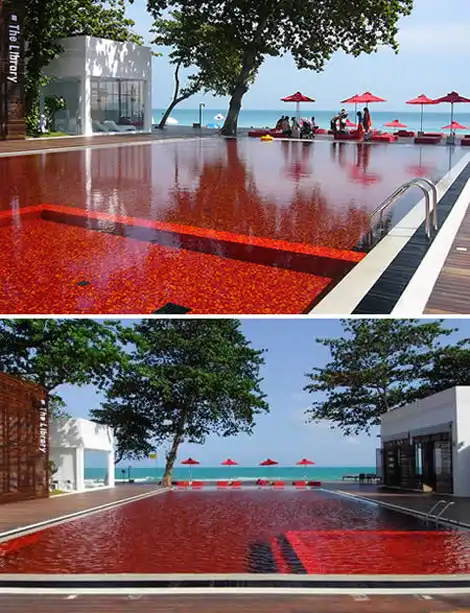 Этот элегантный бассейн кроваво-красного цвета находится в одномиз фешенебельных отелей острова Koh Samui, Тайланд.