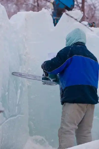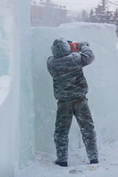 Совсем скоро эти глыбы льда превратятся в настоящее произведение искусства, радующее всех посетителей ледового городка. Для того чтобы все получилось, скульптурам и резчикам по льду приходится серьезно потрудиться, ведь это очень нелегко – изо льда сделать скульптуру. Лед – это настолько капризный материал, что любая ошибка, любой недочет, даже самый мелкий, может привести к порче всей задумки.