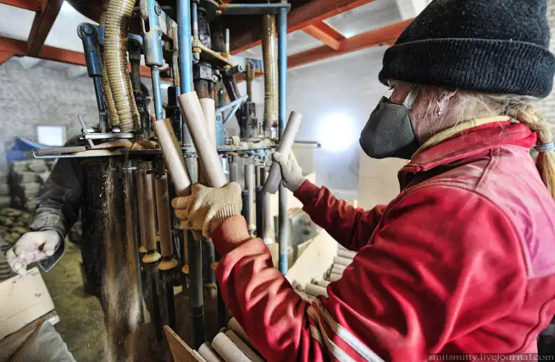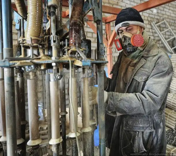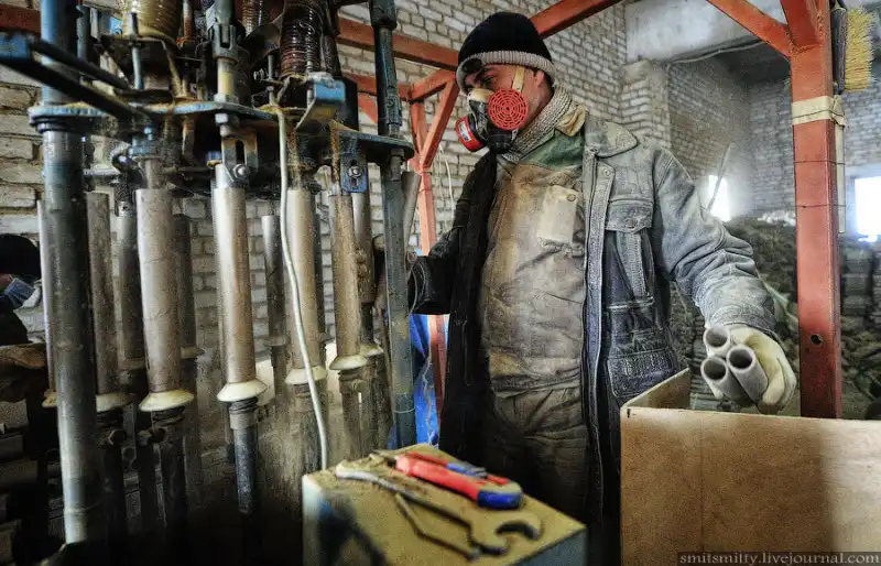 В следующий цех без респиратора не войдешь, тут проходит процесс запрессовки глины в направляющие трубки изделий.