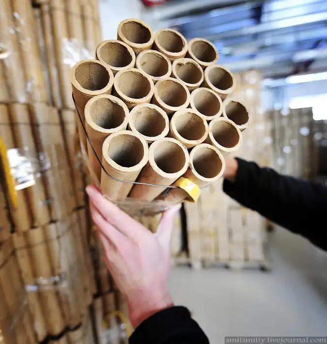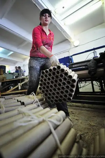 Пиротехническое производство — процесс, который требует жесткого контроля на всех этапах. Чтобы мы с вами увидели яркие огненные вспышки в праздничном небе, каждая гильза проходит через десяток рук, и процесс производства длится 9 дней. Сначала скручивают гильзы из бумаги.