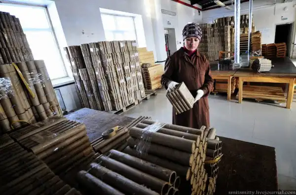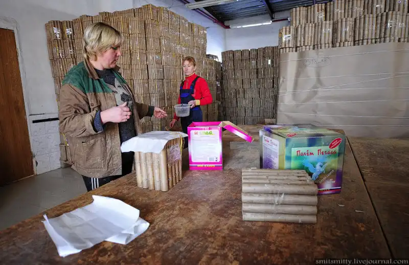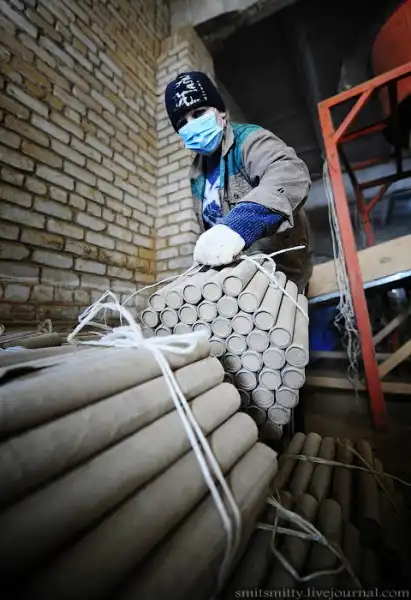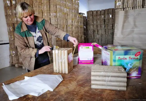 Гильзы с уже набитой глиной прошивают в батарею, соединяют фитилем. Самый ответственный участок производства — специальное помещение, где гильзы заряжают порохом. Потом батареи салюта упаковывают в коробку.