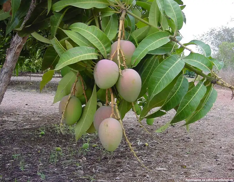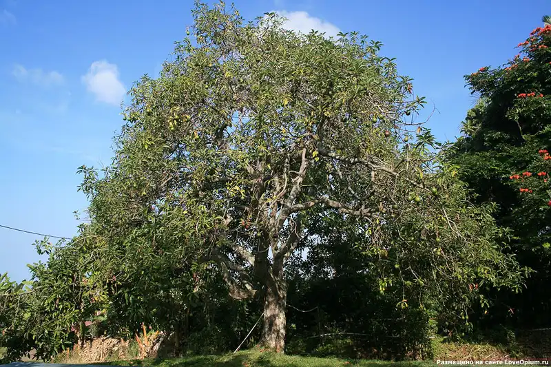 Вечнозелёное манговое дерево имеет высоту 10-45 метров; крона дерева достигает радиуса 10 метров. Цветущее манговое дерево: