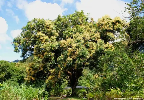 Вечнозелёное дерево обычно бывает около 5—6 м в высоту, однако отмечены случаи, когда высота дерева достигала 13—15 м. Плоды достигают в диаметре 10—15 см. Средний срок, за который плоды поспевают, составляет примерно 9—12 месяцев. (Фото Sarah Biggart):